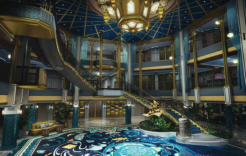 As for the brand new Disney Treasure, so far we know that the ship’s decor will pick up on themes from the Disney movie Aladdin, with a signature statue in the ship’s soaring Grand Hall of Aladdin and Jasmine and the Magic Carpet.