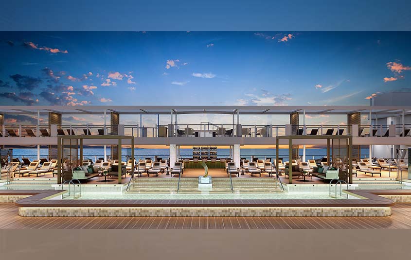 In a first for the cruise line, the ship will have an asymmetrical design, one that will give rise to all-new outdoor spaces for an unprecedented openness to the destination, with a reimagined, outward-facing pool deck; an al fresco dining area; and a sky bar that offers panoramic views from the ship’s aft.