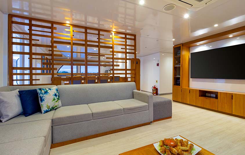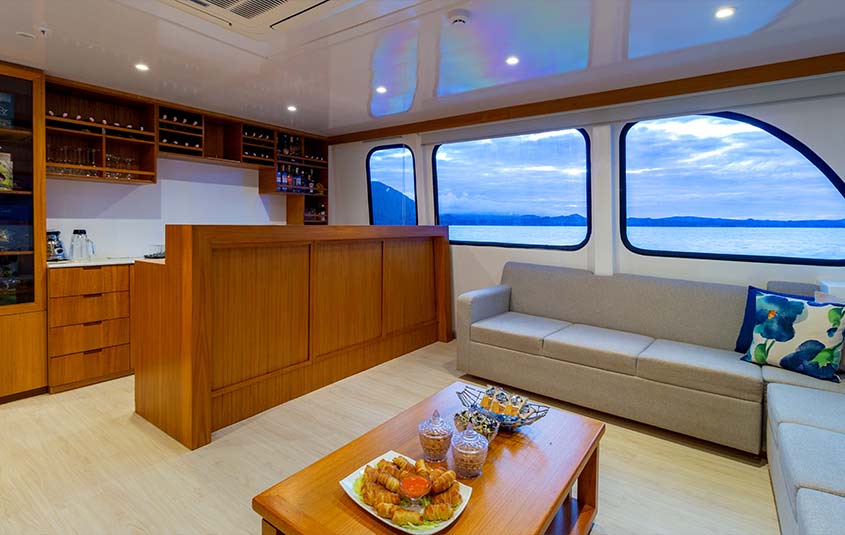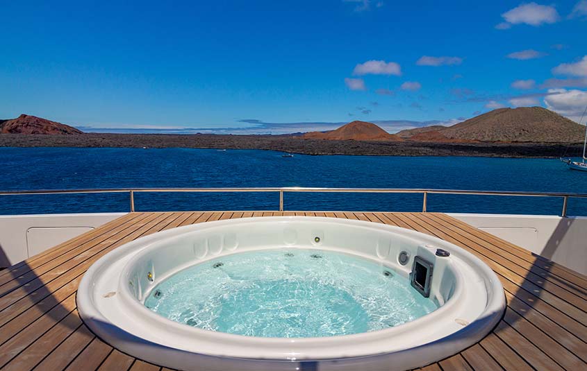 Common areas onboard include an expansive third deck with lounge chairs for sunbathing, a covered cocktail bar, grill station and outdoor Jacuzzi. An indoor, air-conditioned salon with a large video screen enables visual presentations from trained naturalists who will guide each group’s tour.