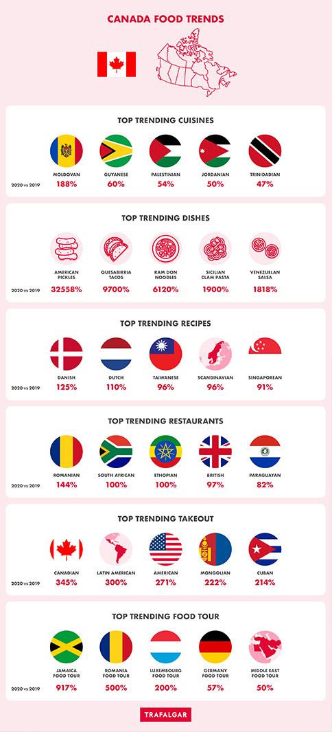 - Canadians certainly loved travelling with their taste buds. In 2020, Canada searched for new exciting flavours from Moldova’s cuisine (+188%), Guyana’s food (+60%) and Jordan’s booming food scene (+50%).