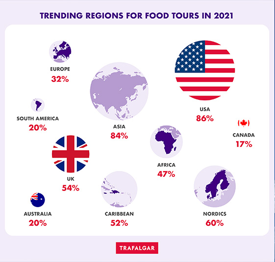 - Travel might have been off limits for many, but that didn’t stop travel aficionados. With more than 15,000 searches, New Orleans was the jewel of food tour destinations putting the USA on the map for future travel. Demand for food tours globally increased by 24% in the first 3 months of 2021 alone.