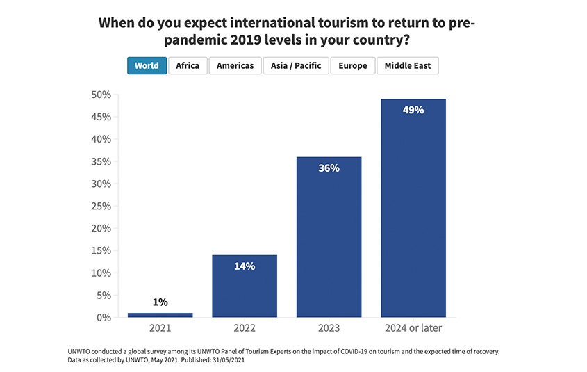 Three in five (60%) of the UNWTO’s tourism experts say they expect a rebound in international tourism only in 2022, up from 50% in the January 2021 survey.