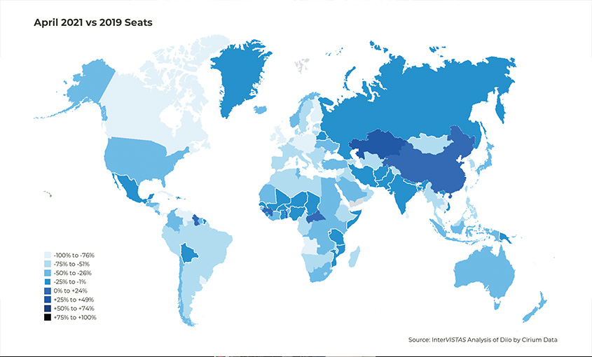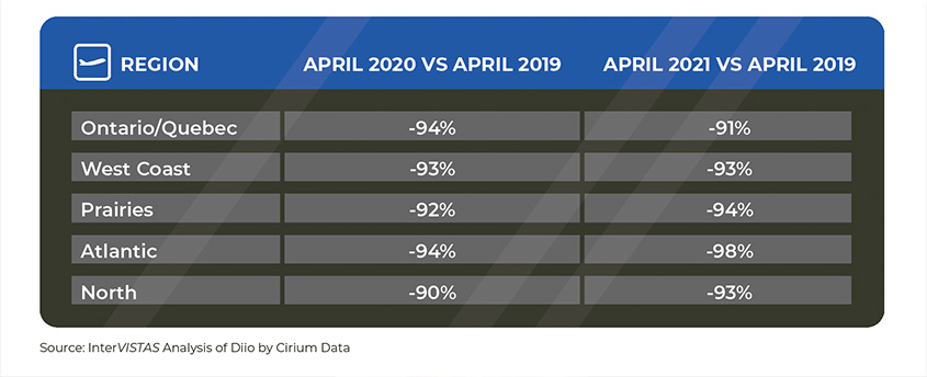 • Direct connectivity fell more than 90% across all Canadian regions in April 2020 versus April 2019. The picture for 2021 is just as dire, says the CAC, with direct connectivity falling even further compared to 2019.